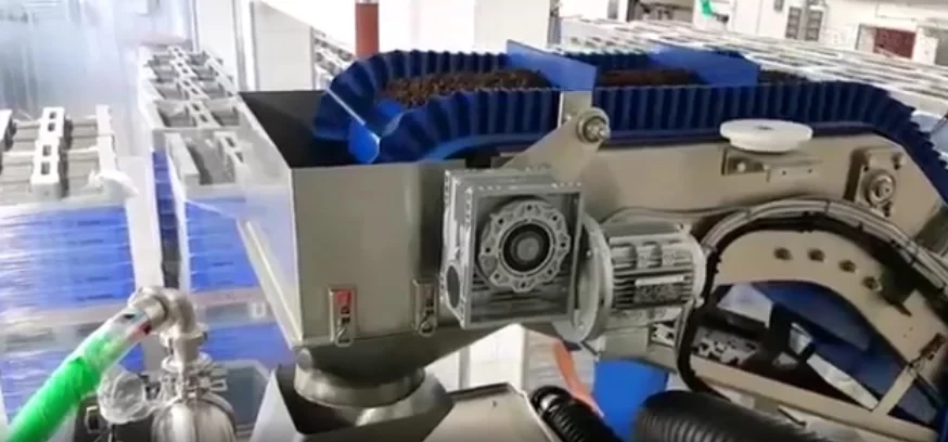 A függőleges csomagológép belsejéről készült közeli felvétel bemutatja a töltési folyamatot: A mazsolát a zacskóba töltik, majd egy adag folyadékot – ami gin vagy rum lehet – adnak hozzá vagy fecskendeznek be, végül újabb réteg mazsolát helyeznek a zacskóba, mielőtt azokat lezárják.