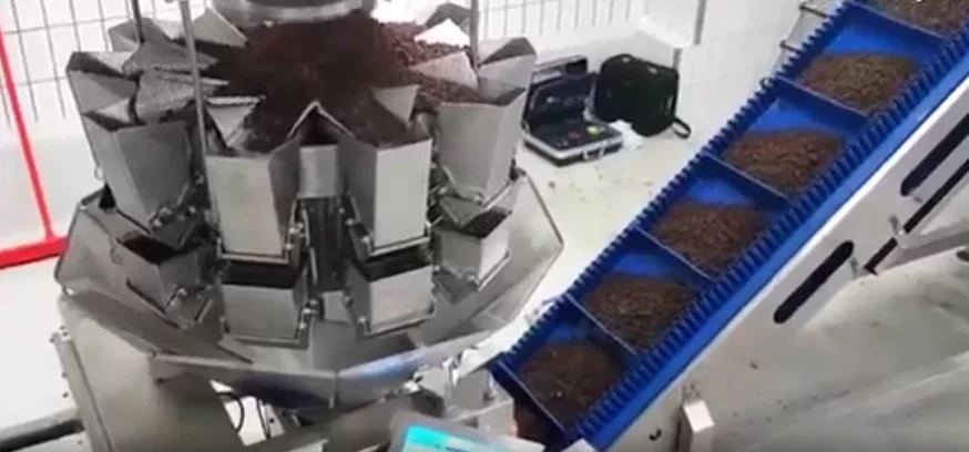 A szárított mazsolát egy meghatározott mennyiségű rummal vagy ginnel együtt csomagolják zacskókba. Először a mazsolát egy szállítószalag szállítja a többfejes mérleghez, ahol a termék lassan a különböző mérőegységekbe hullik. Egy speciális szoftver kiszámítja a mérlegek legjobb kombinációját a megfelelő súly eléréséhez. A mérőegységek kinyílnak, és a lemért mazsola egy szállítószalagra esik, amely a csomagológéphez vezeti.